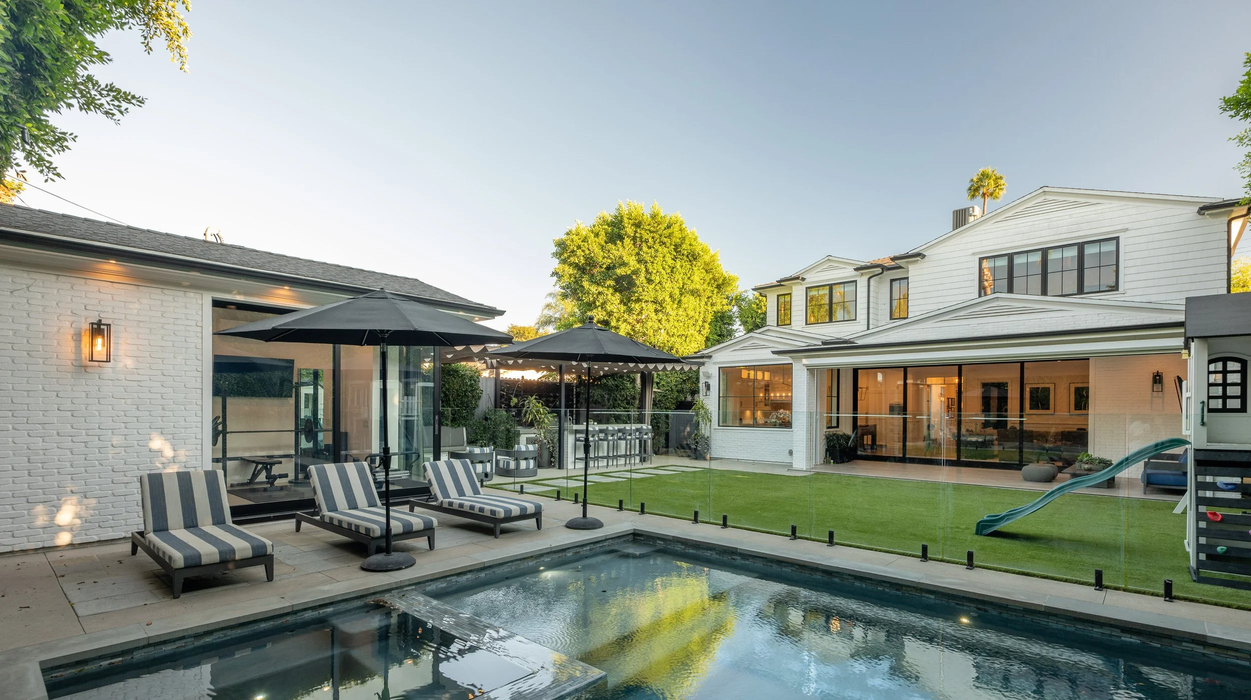 Walls of floor-to-ceiling pocket glass doors lead to a beautifully landscaped entertainer’s backyard featuring a covered patio, pool and spa, fire pit, full barbecue island, and spacious side and rear yards.